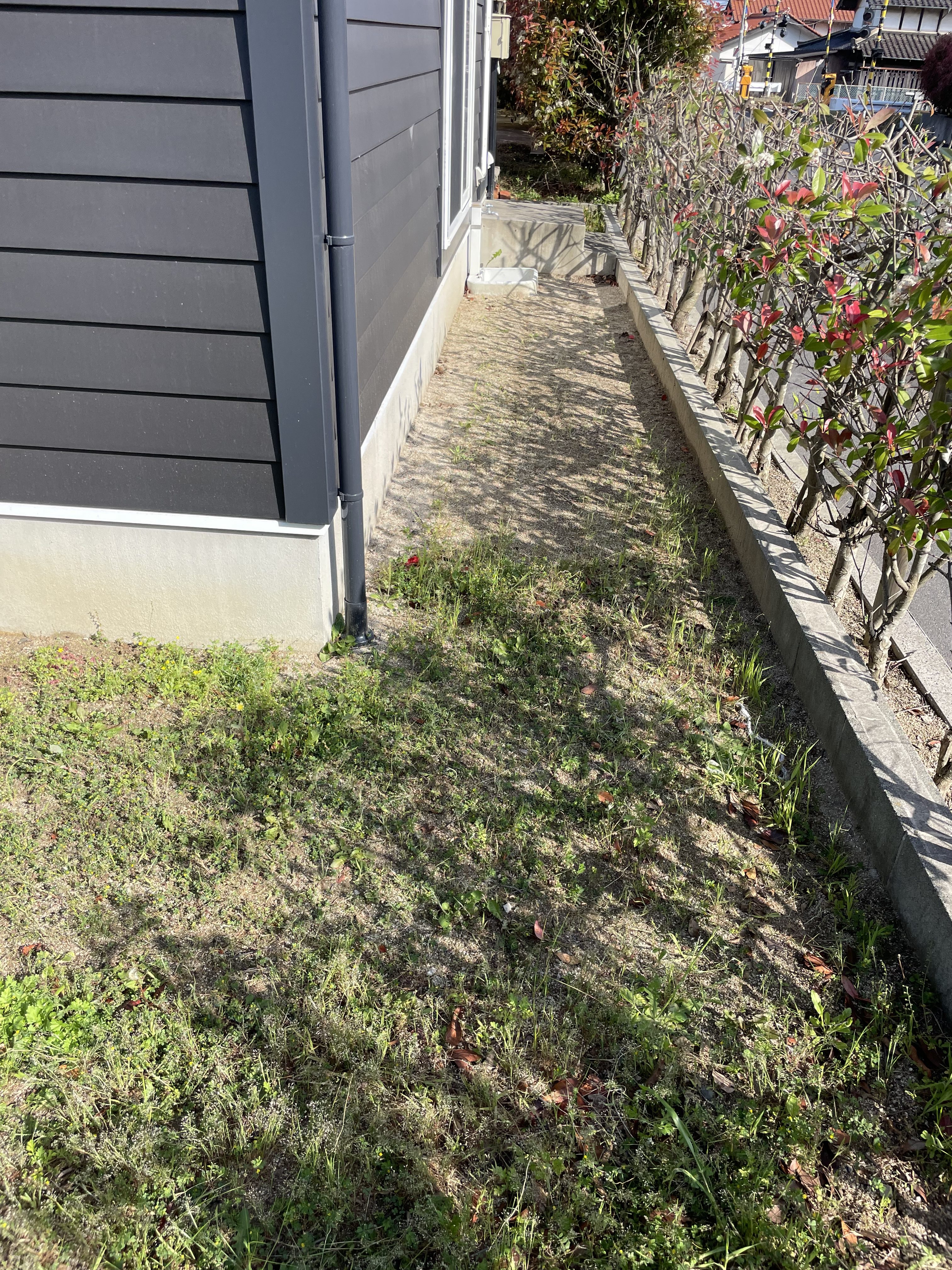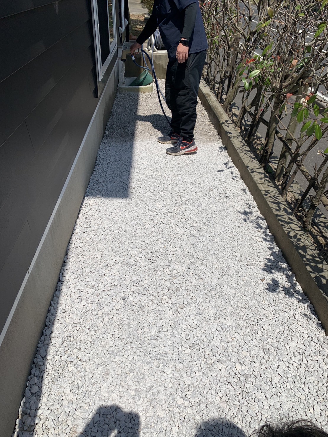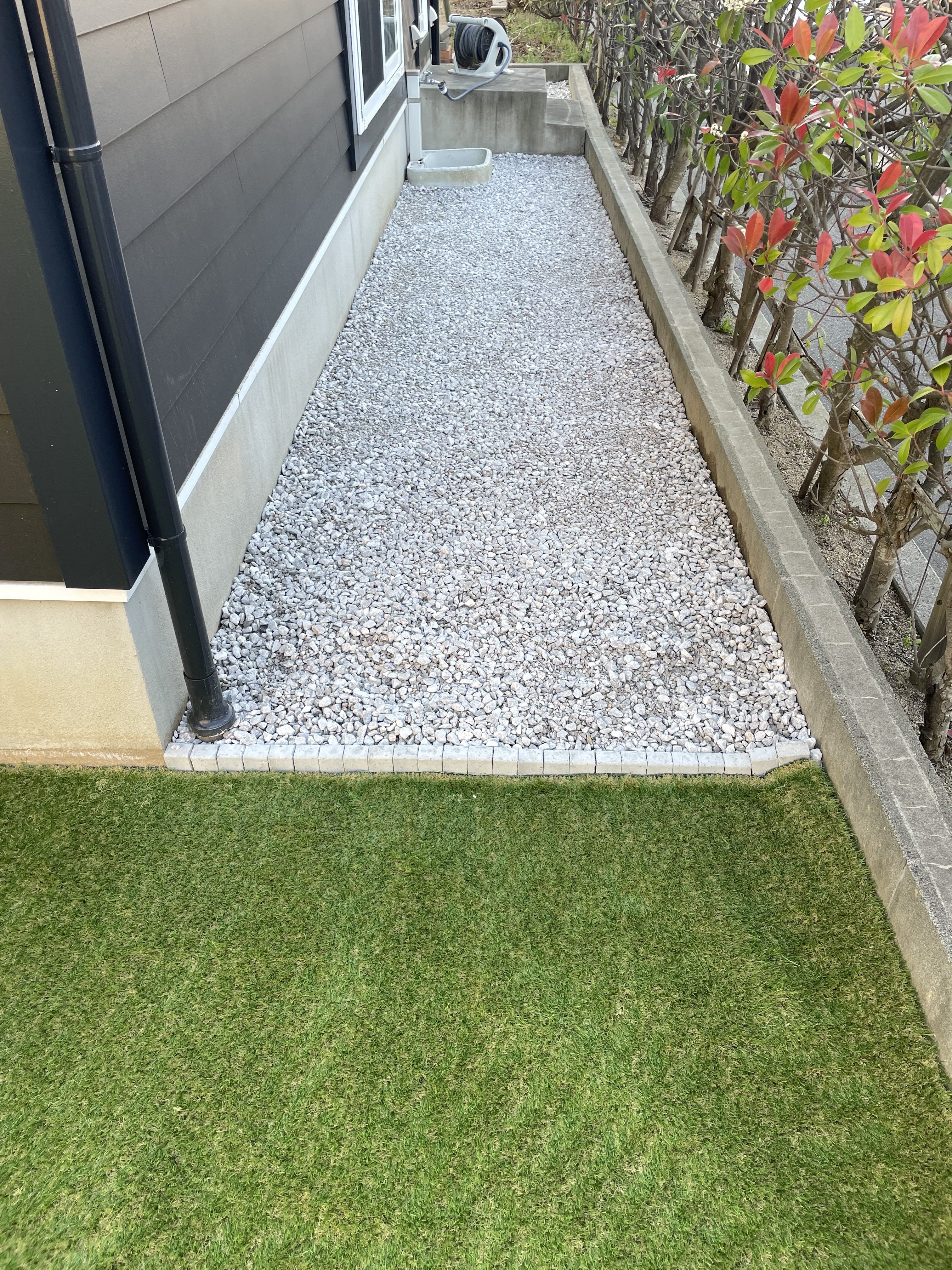 建物周りの細い部分はどうしようかとお悩みだったので石灰砕石をお勧めし施工しました。