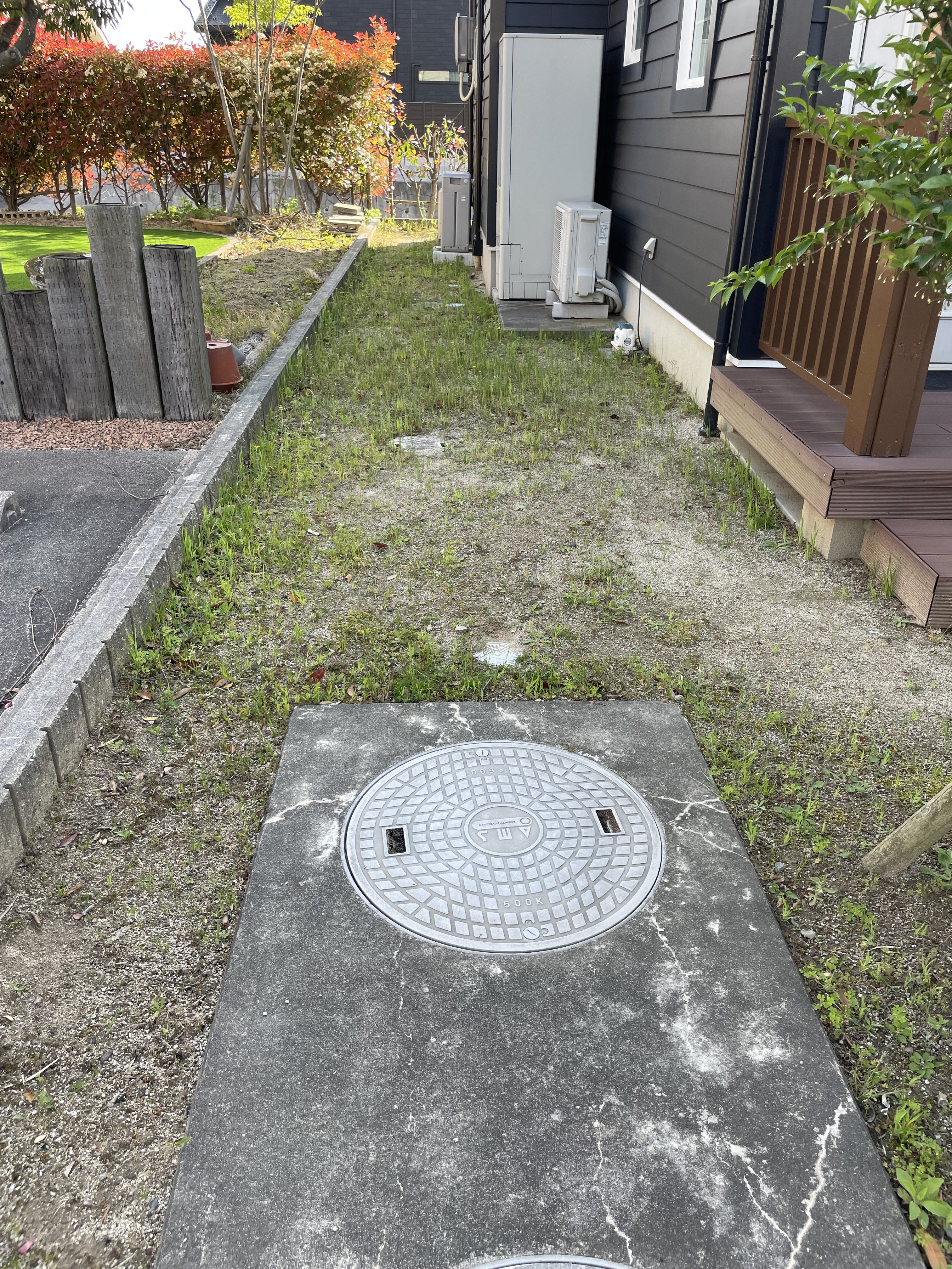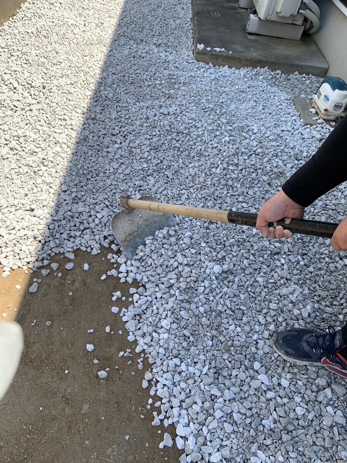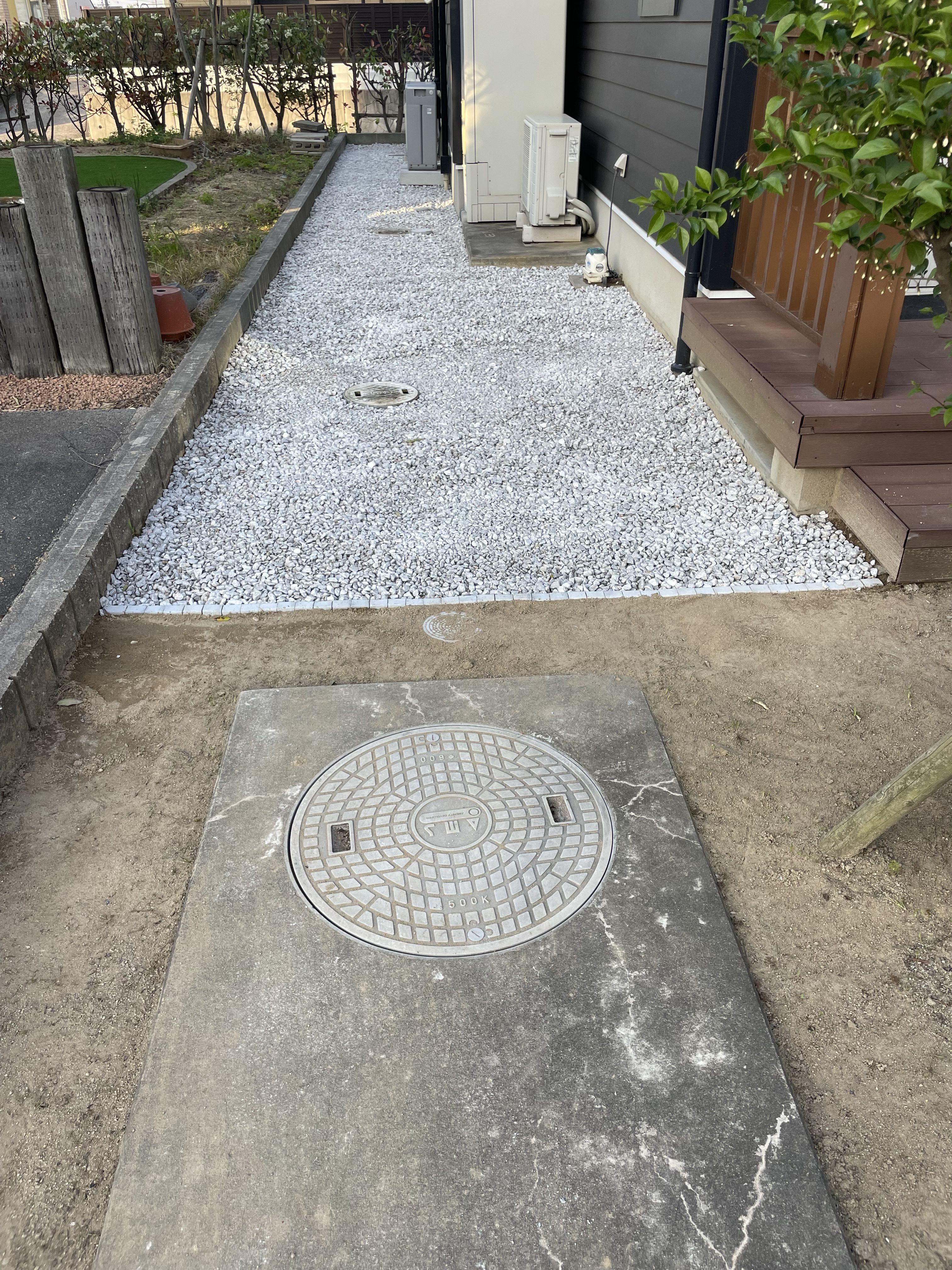 建物周りの細い部分はどうしようかとお悩みだったので石灰砕石をお勧めし施工しました。