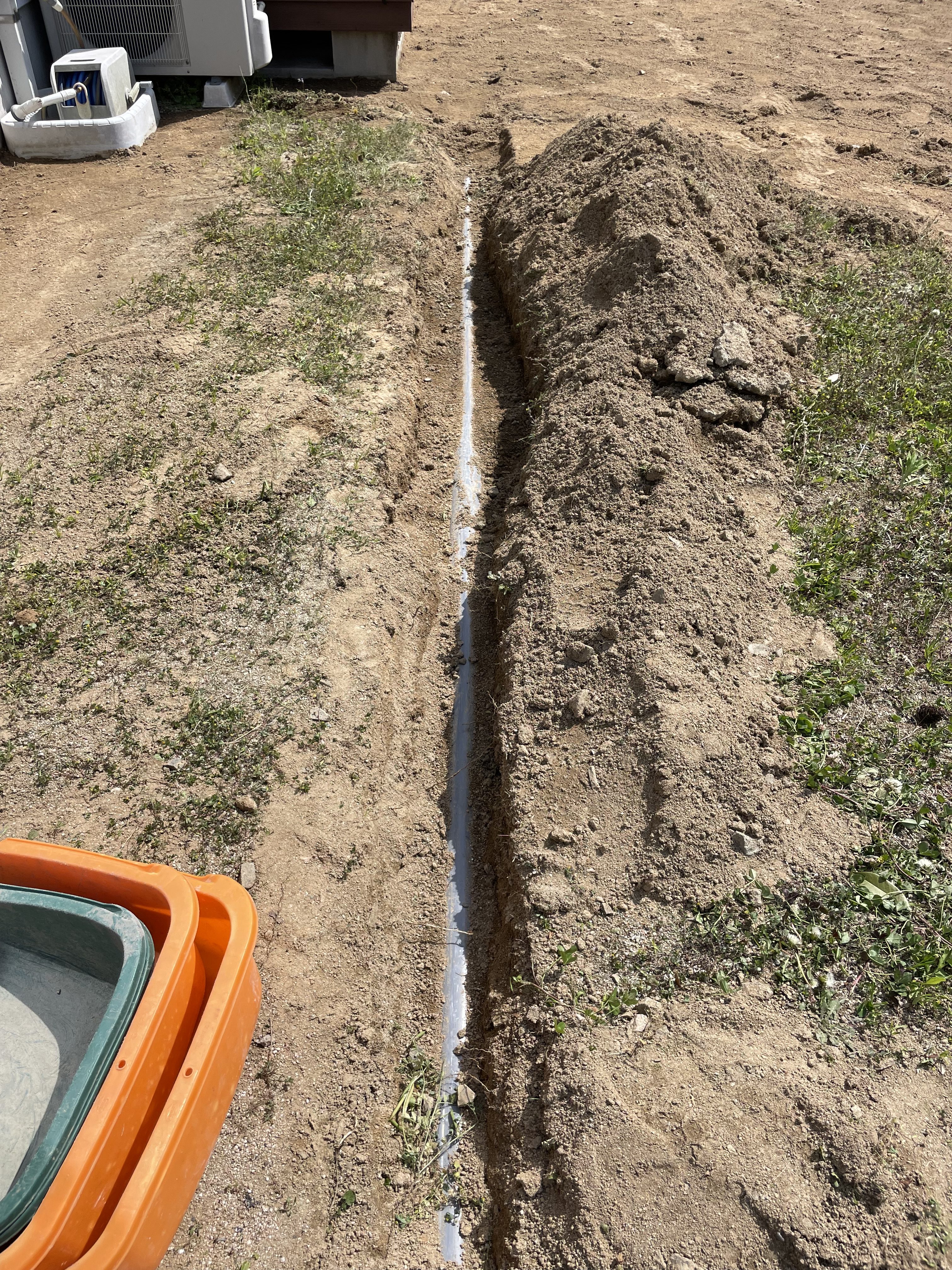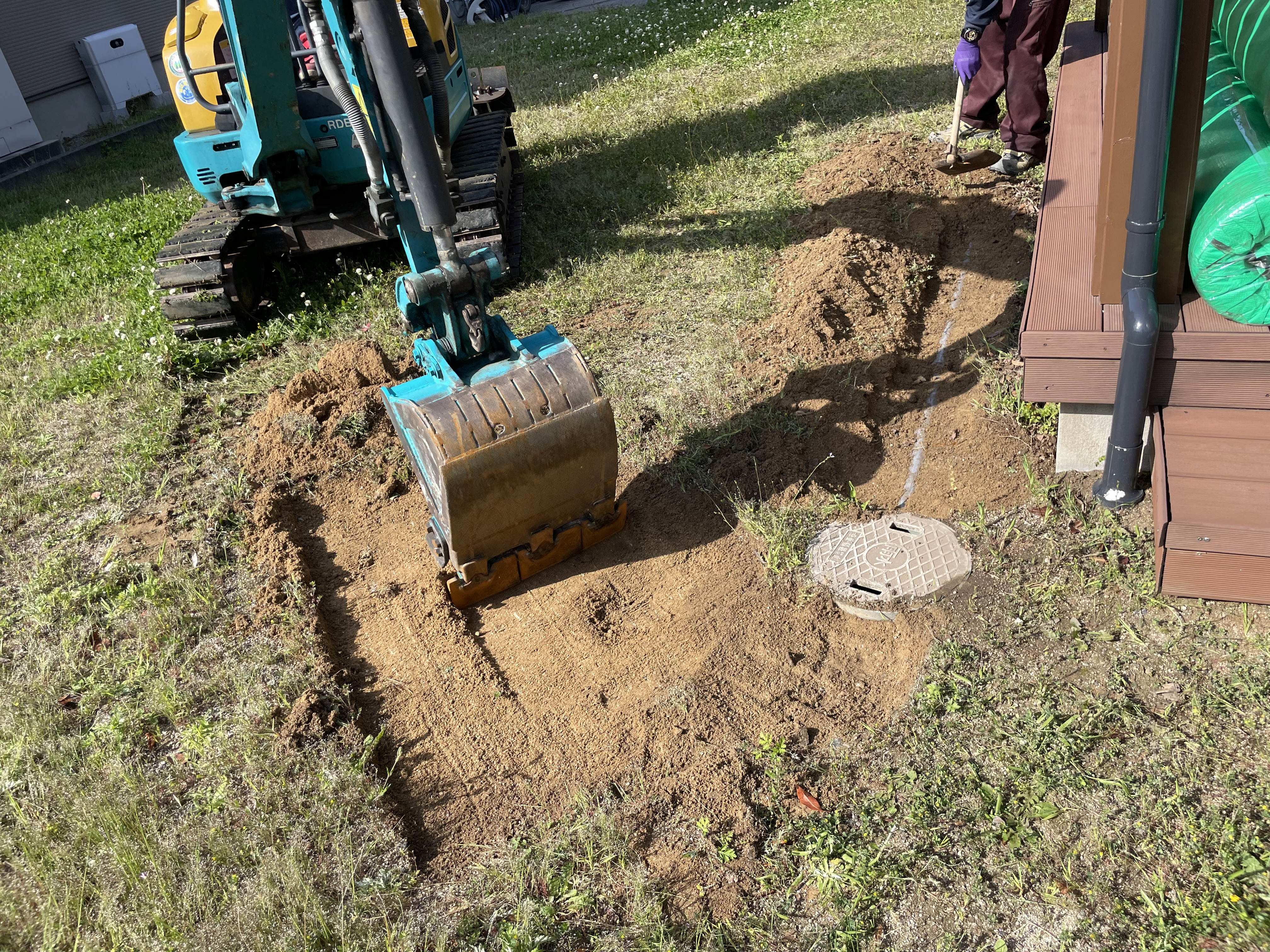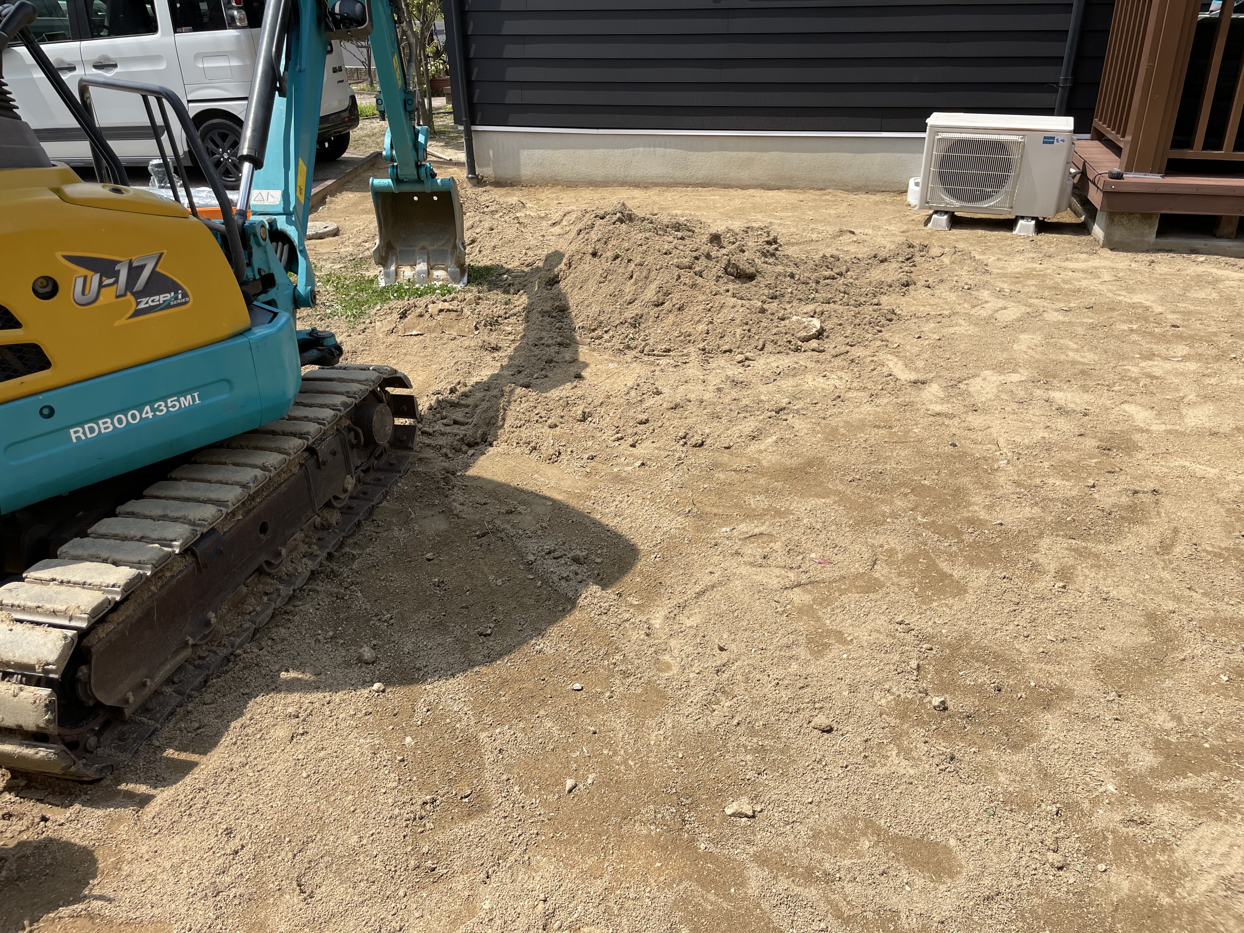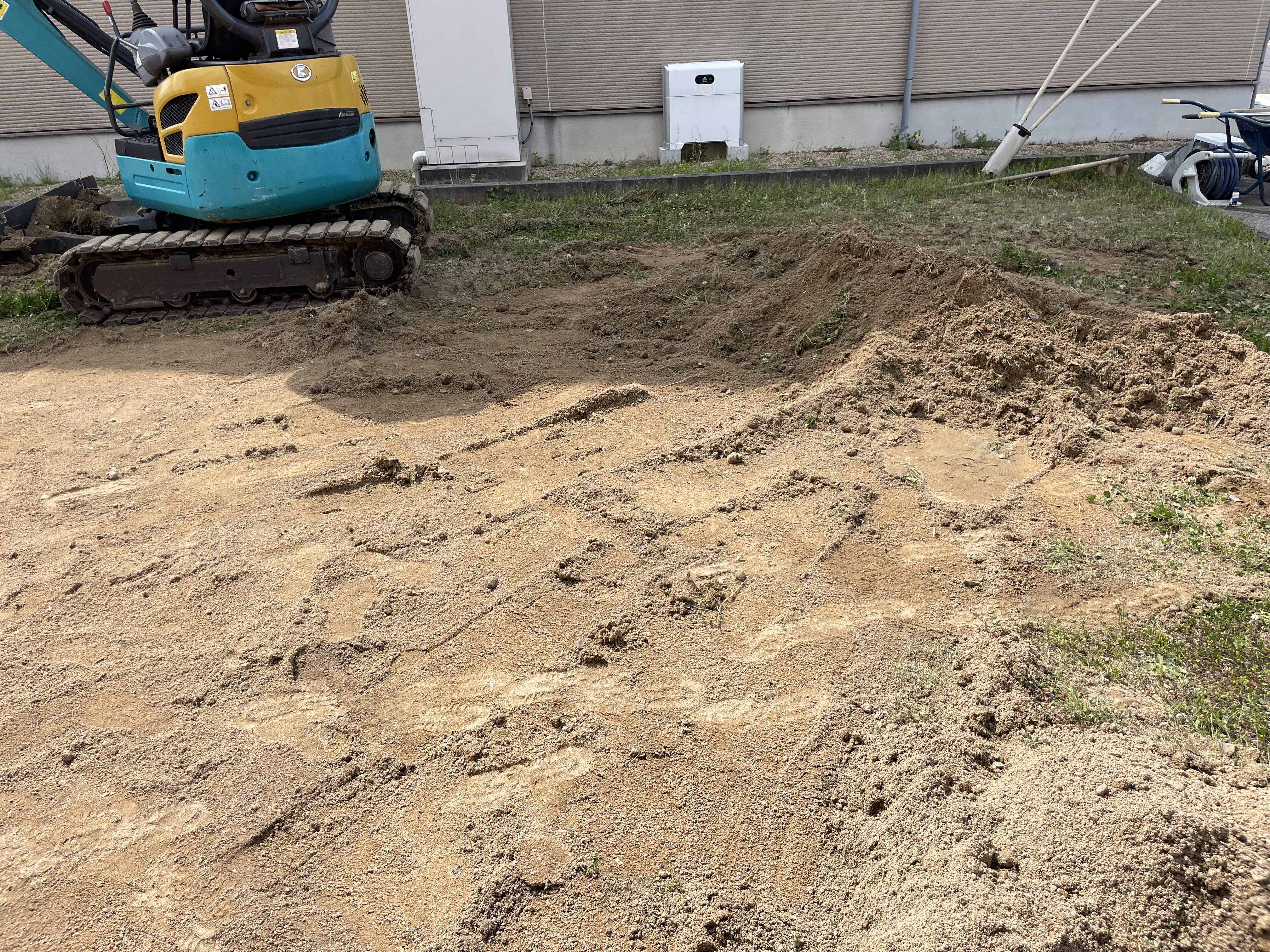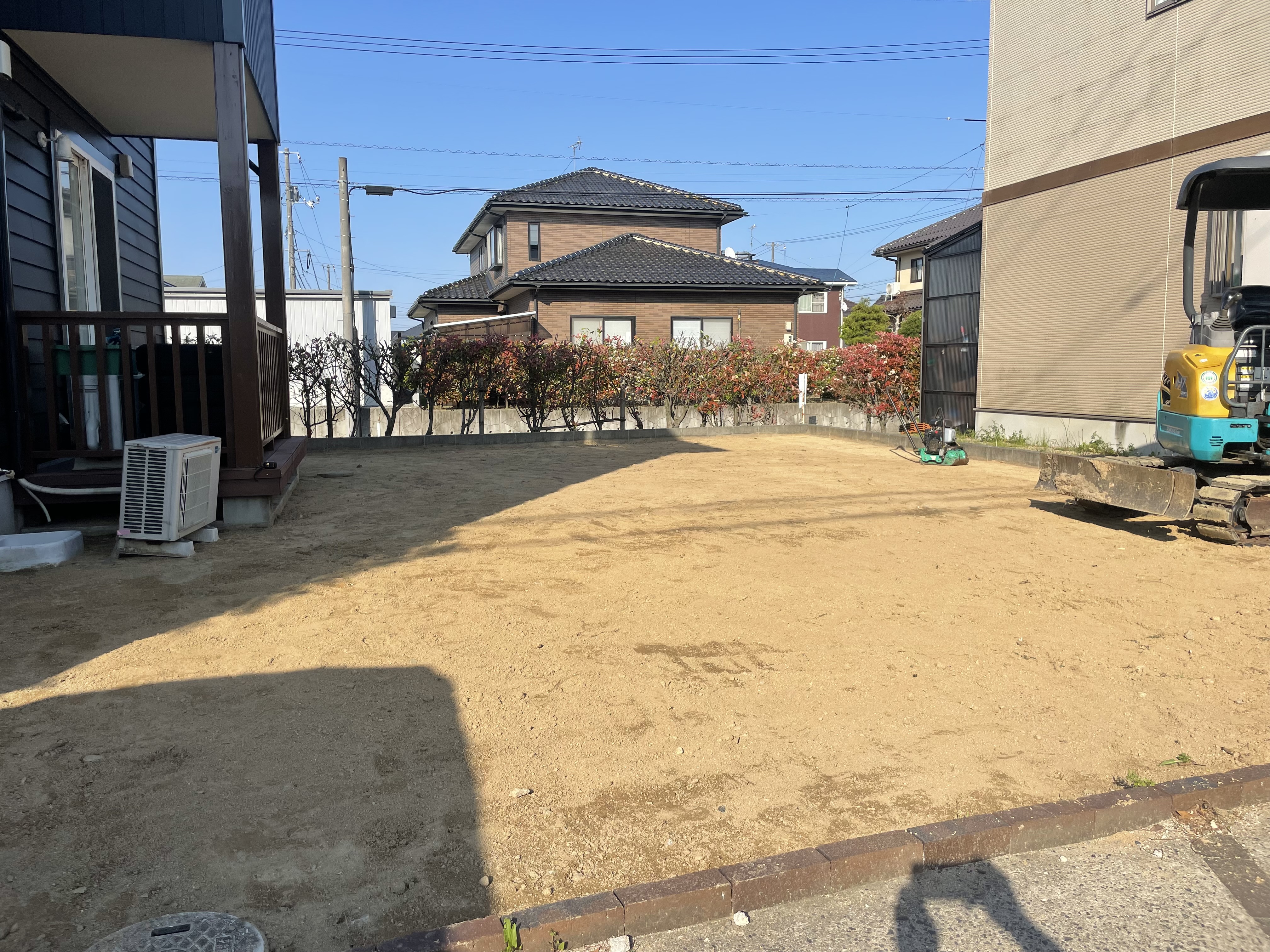 広いお庭の防草工事でしたので重機を搬入し既存の真砂を鋤取り、施主様のご準備された防草シートと人工芝を施工。